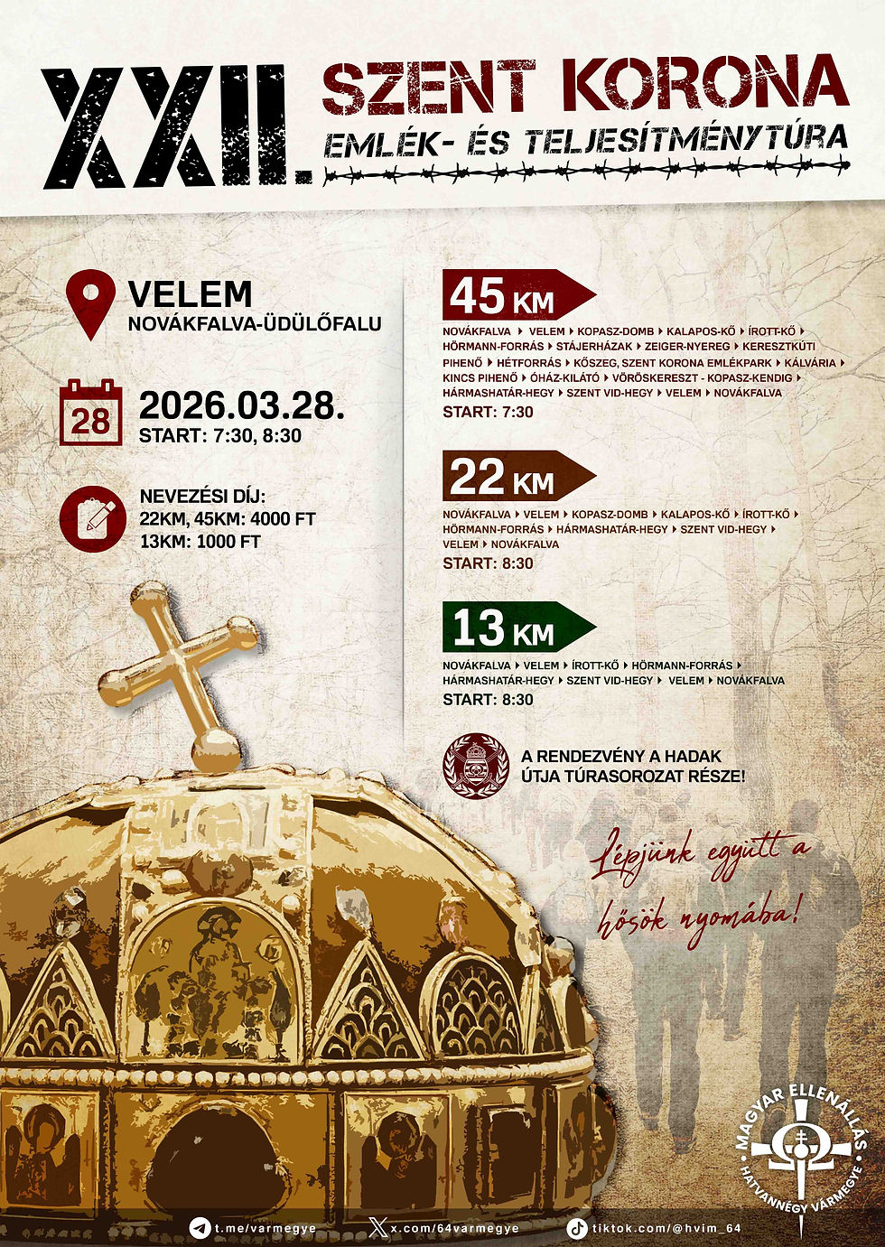 Idén 22. alkalommal emlékezünk meg azokról a koronaőrökről, akik a második világháború végén a Kőszegi-hegységben őrizték a Szent Koronát, mielőtt 33 éves idegen száműzetésbe került volna. Ezért szervezzük meg a túrát 2005 óta minden évben, hol nyilvánosan, hol zártkörűen, tavaly viszont teljesítménytúrává alakítottuk, idén pedig tovább bővítettük, ugyanis a 22 és a 45 km-es táv mellett ez évben már egy családbarát 13 km-es távon is indulhatnak azok, akik a megemlékezést egy közös családi túrázással kötnék össze.